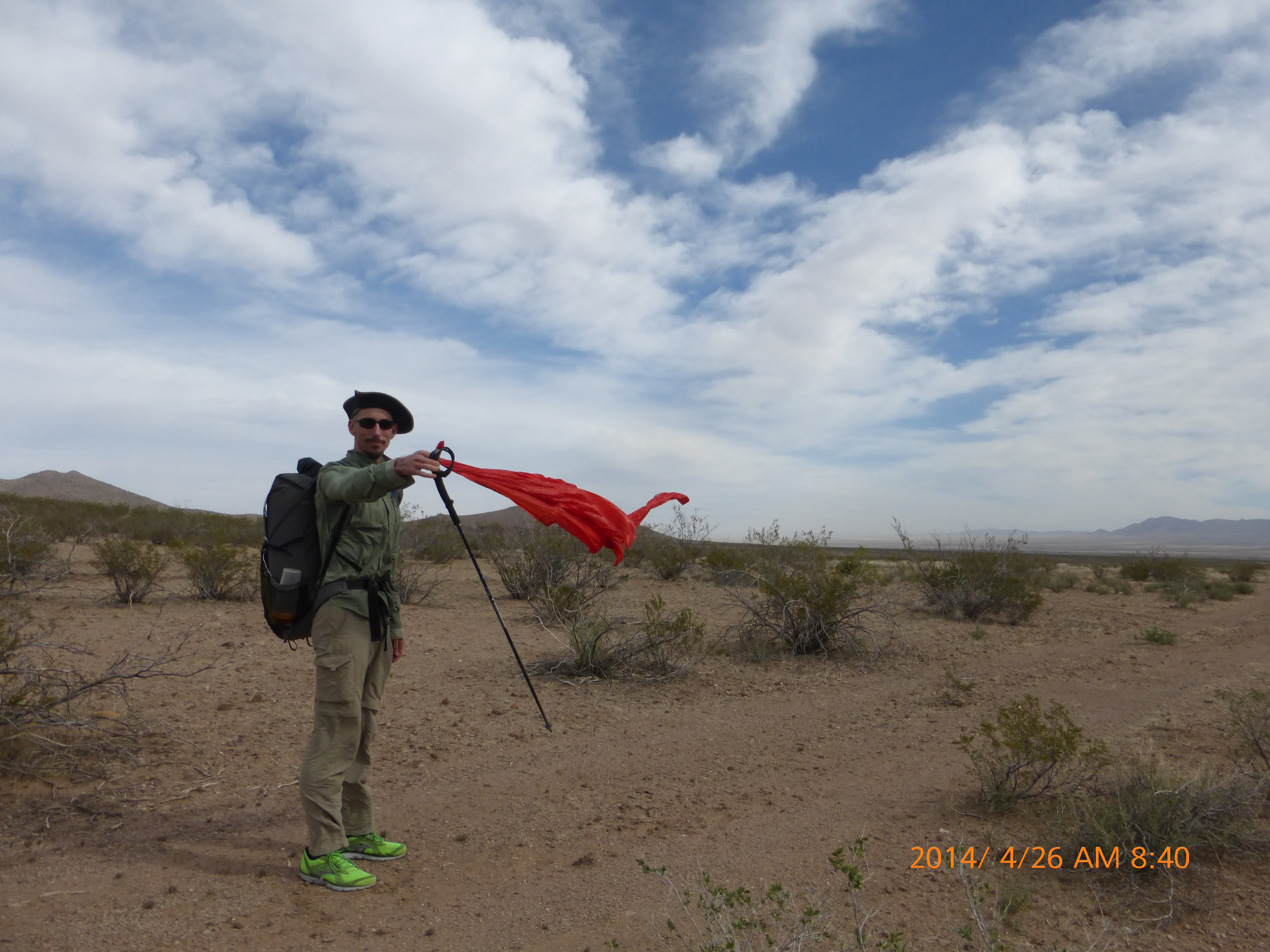 The last hours of the afternoon we hiked up and over hills into washes rolling NE over easy enough terrain. The challenge was the wind that blew us around. At times when Gabriel and Roadrunner were ahead of me I could see their feet were not aligned with their shoulders, feet blown out from under them. Sometimes we’d pause between steps to brace ourselves so that we didn’t stagger into a cholla or prickley pear cactus.