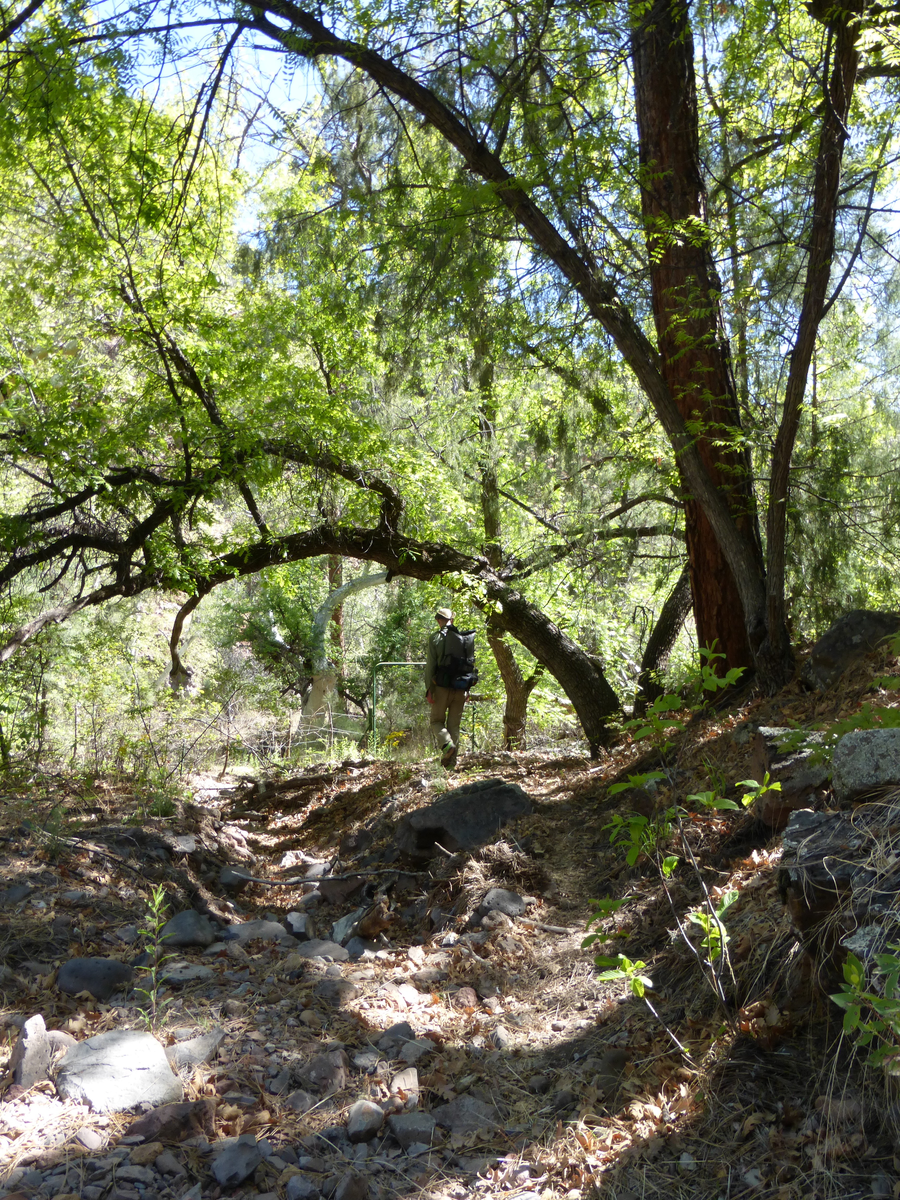 We descended down, down, down to the river. With each switchback we are closer to the canopy of sycamore, box elder, gamble oak and cottonwood. With the final switchback we go below the trees and come to a gate and an arch of lush green foliage. Walking under it I feel as if we have passed into a secret garden.