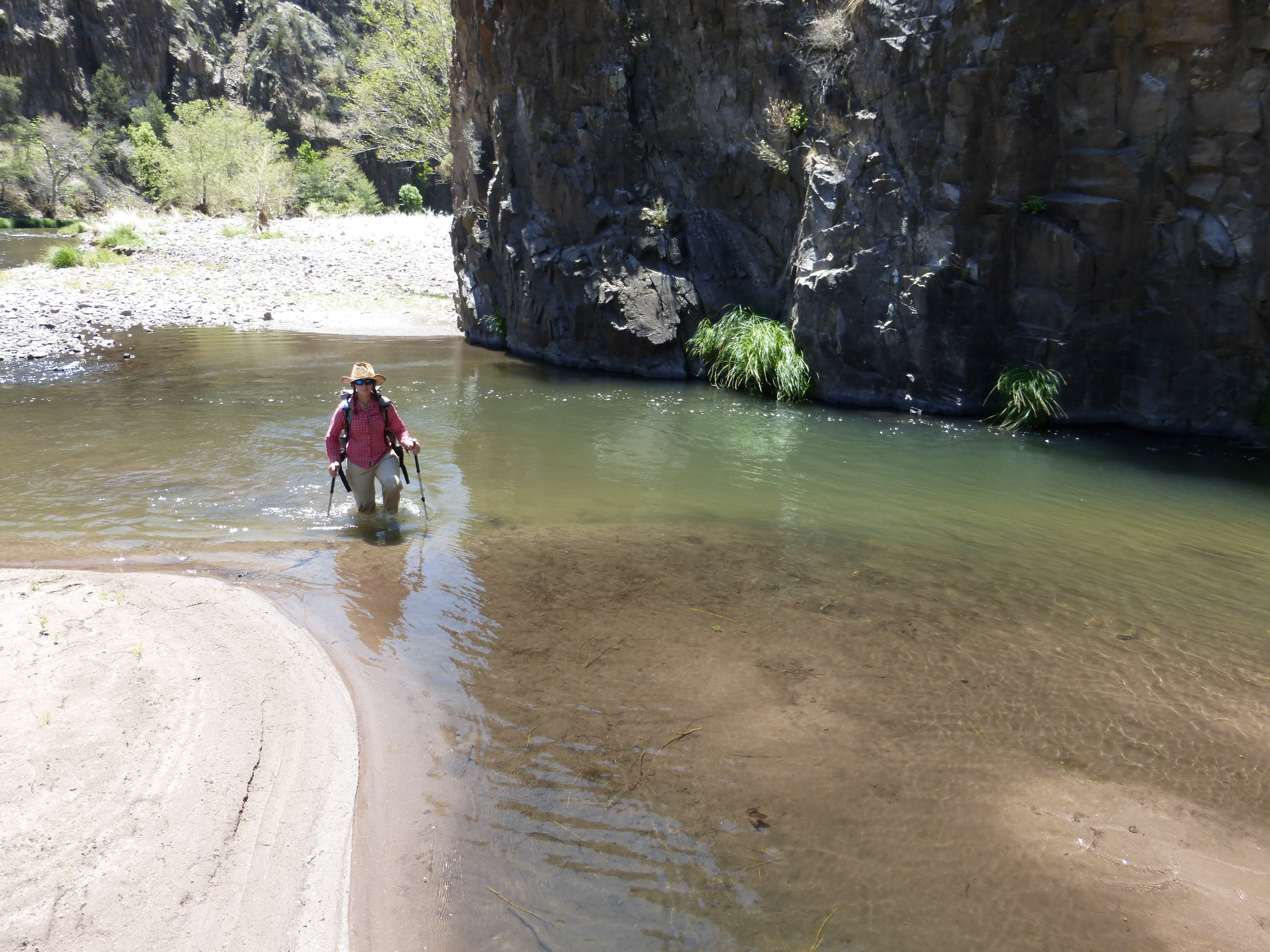 We go on, meeting the Middle Fork of the Gila. We pause and smile again. At the bend where the trail meets the river the channel is knee deep and more than 50 feet wide.