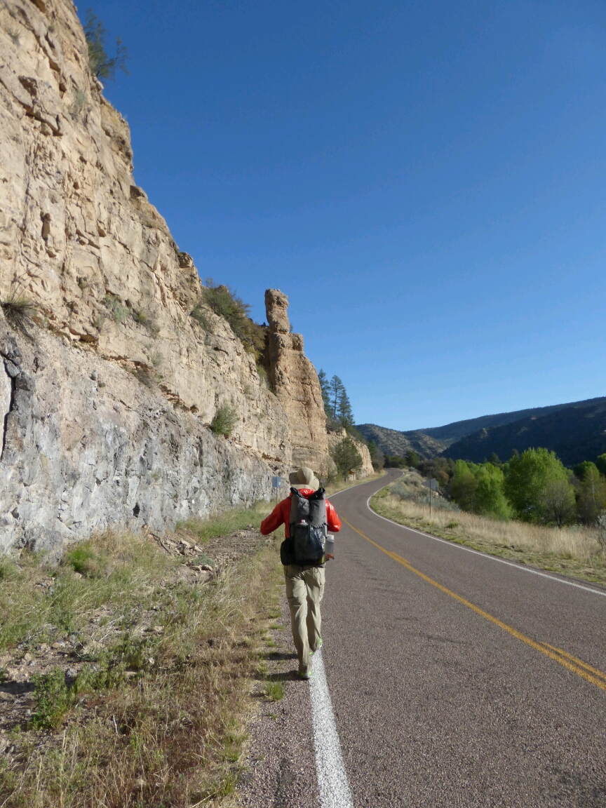 We soon warmed up by fording the Gila, the water being warmer than the air. Two fords later we were in sunlight at the Gila River Bridge and hiking up the road to Doc Cambells Post. A golden sunny Saturday morning and quiet alongside the road. Pleasant walking. We admired distant hoodoos and made our game plan for the day.