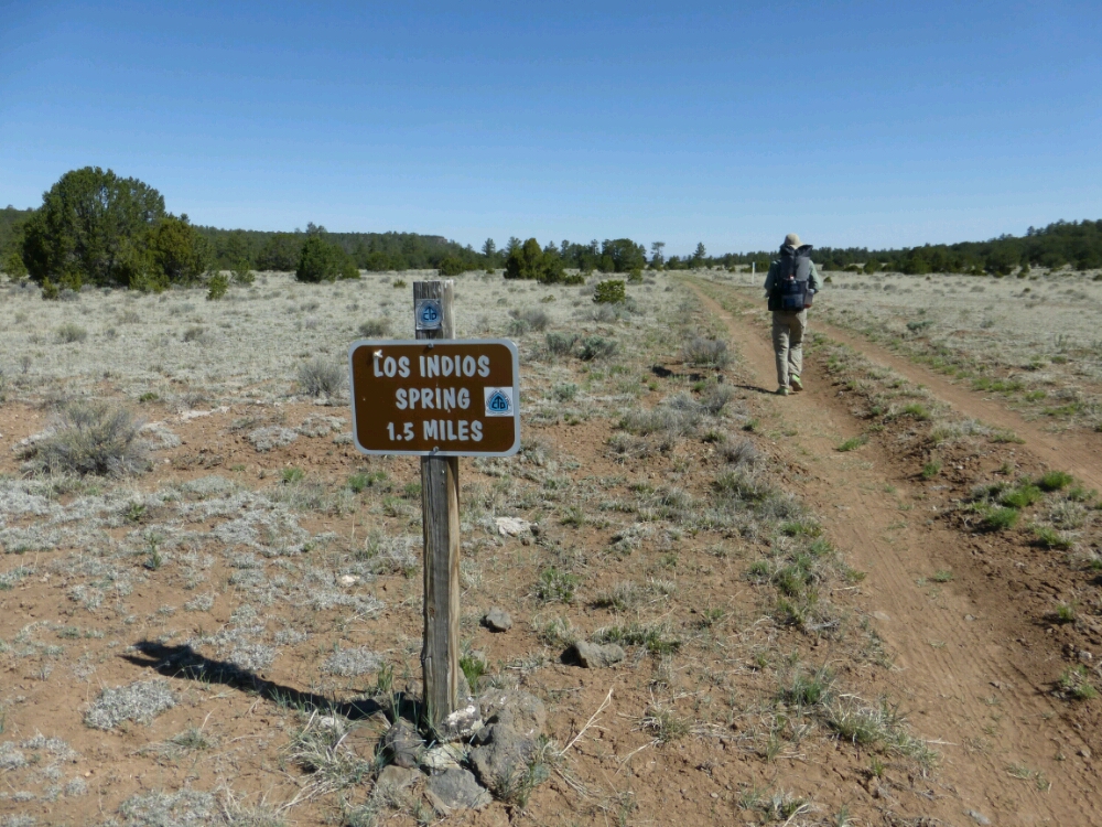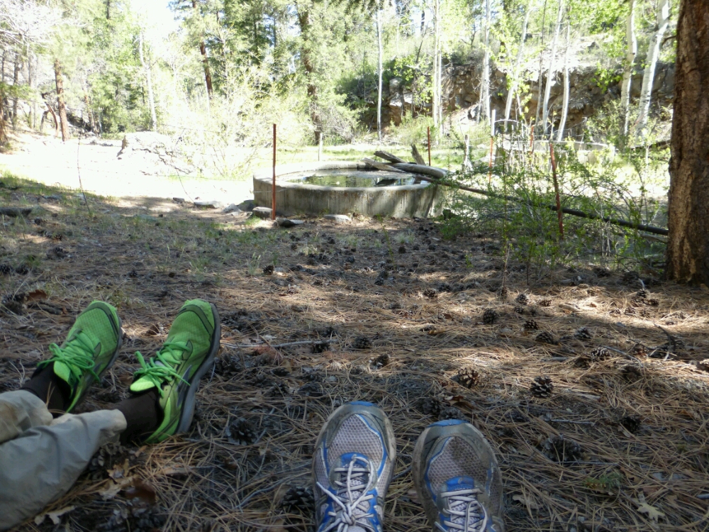 After yesterday’s waterless late afternoon, Ojo de los Indios is all the more appreciated. A half mile off the CDT, the spring’s cold, clear water is fenced off from cattle and tucked in a basalt canyon. Next to the spring, aspens flutter their new leaves, soft green grass grows unshorn, there is shade in clean comfy Pondeosa duff. Gabriel and I took a long breakfast break to enjoy the tranquil setting. And fill up on amazing water for another dry stretch.
