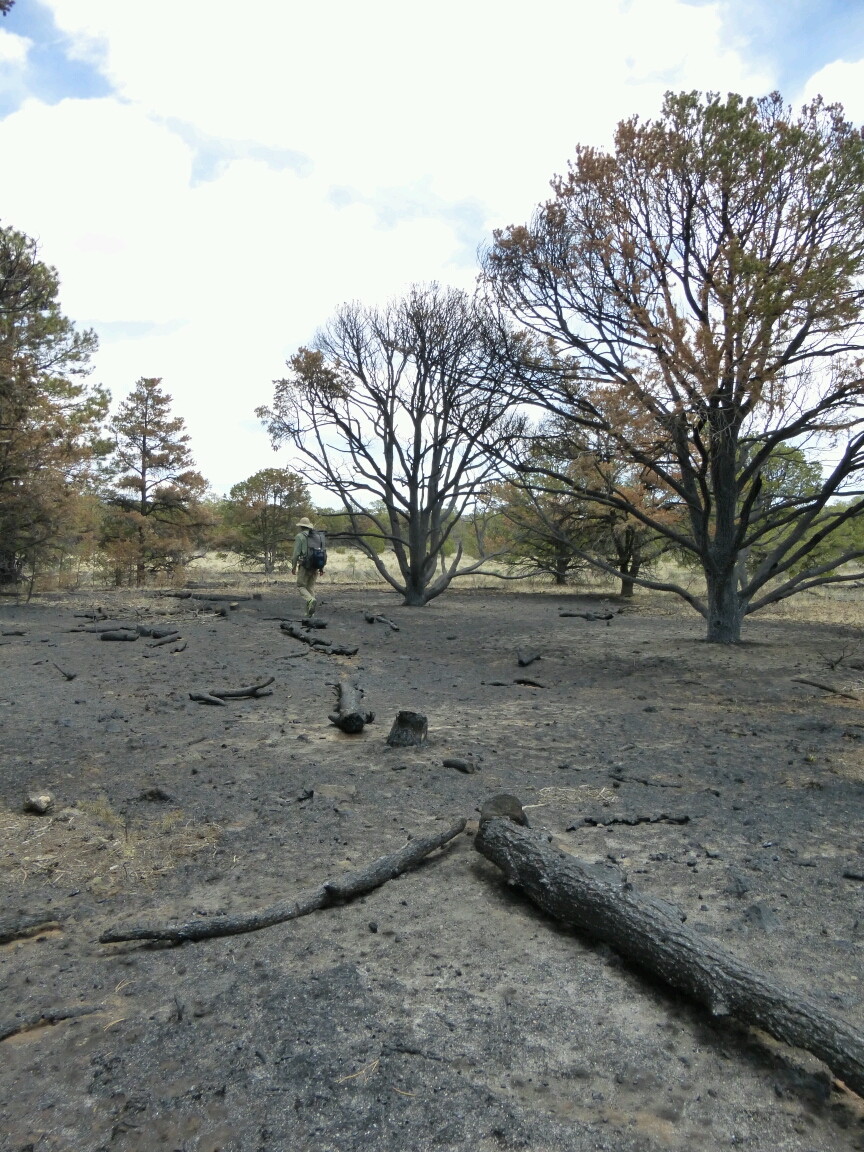 Not wanting to risk going near a fire (though mildly tempted at the same time), we got out our maps, took a bearing for the road alternate and headed east. Gabriel wondered if it may be a prescribed fire (smart guy!, he’s been hanging out with forest ecology folk). But I was pretty quick to dismiss the idea. Who would start a burn during a red flag warning and not post any notices about it at trailheads (such as the TH at Ojo de los Indios)? Or leave the fire unstaffed? Turns out, the BLM.