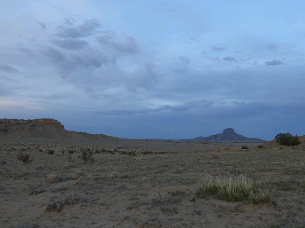 The cool of evening had us walking across arid desert into arroyos, dry river beds, across cholla flats with views of high mesas and peaks. Cerro Cuate and El Cabezon dominating in form and view. Gorgeous sparse country; some places only mats of buckwheat grew in the dusty cracked clay.