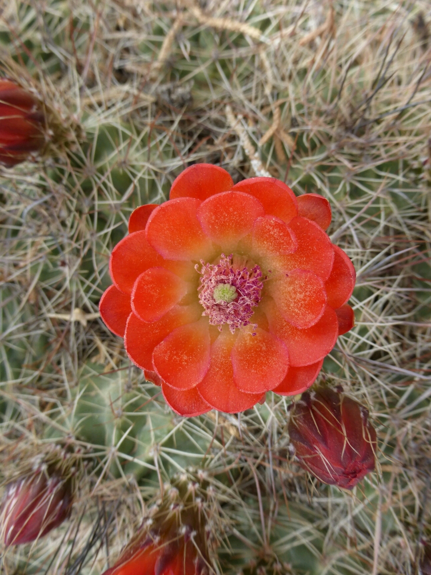 Climbing up the next mesa we admired claret cup hedgehog cactus and rainbow cactus. Pinyons and junipers cling to the red sandstone rim and hang off the edge rock.