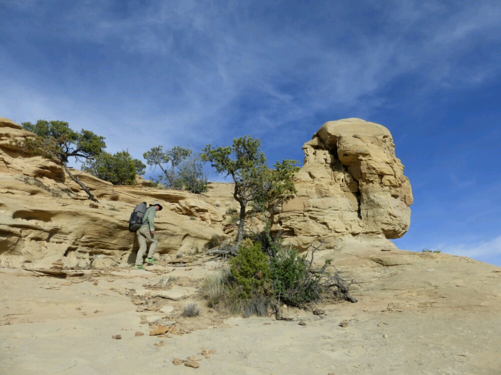 Up the sandstone steps of the Mesa San Luis we entered a slickrock world. White and buff sandstone formations rolling and twisting about. It felt like we were hiking through a sci-fi movie set. Only we were on trail!