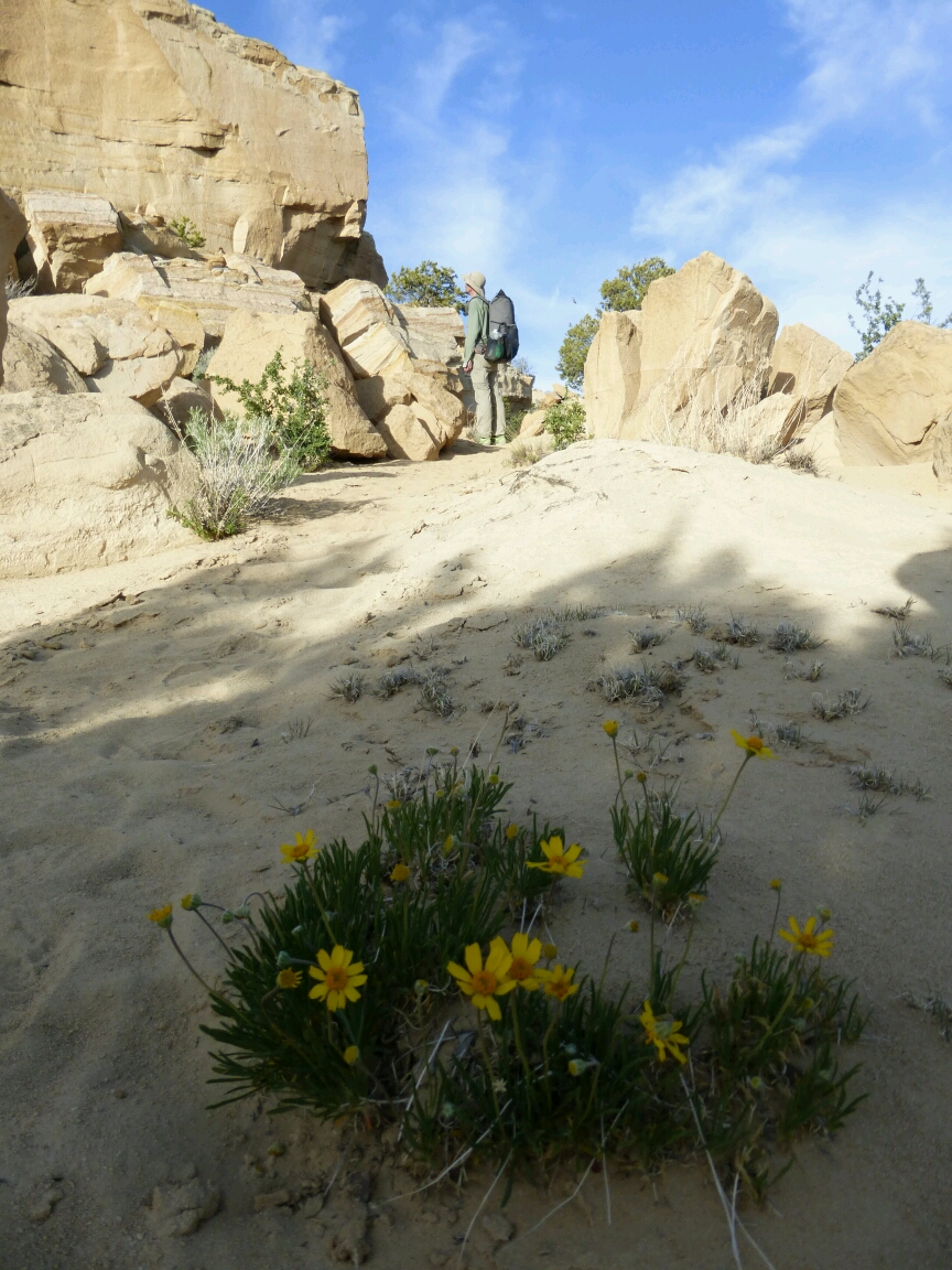 We rolled up and over sandstone mesas for most if the morning. Stopping to watch rabbits, lizards, new flowers. Inspected supposed water sources the trail markers suggested were around (all dry, good we were carrying what we needed).