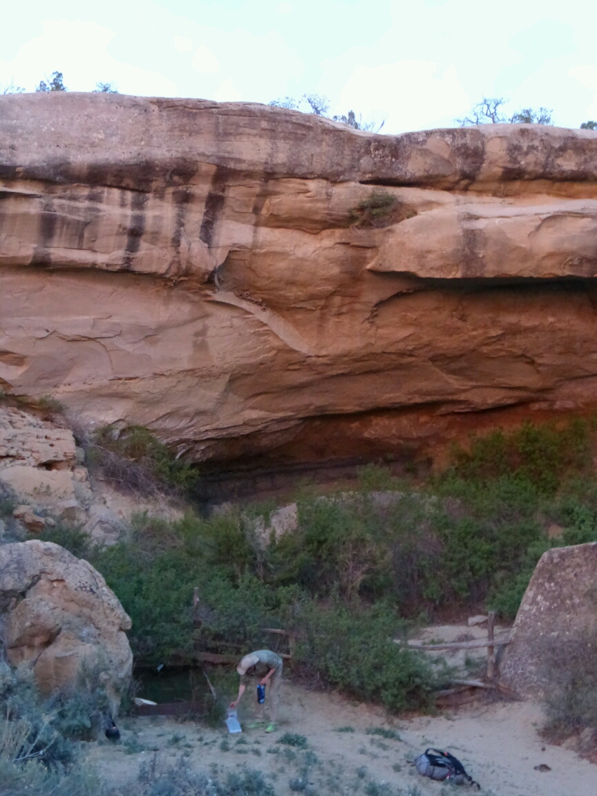 Jones Canyon Spring. Below a sandstone cave. Cliff swallow nests cover the eaves of the rock. Lush vegetation all around. Cold, clean, life affirming water fills a trough from slow but steady flowing spring. Animal tracks in sand affirming this is the place. Bats flit about in the last colors of twilight.