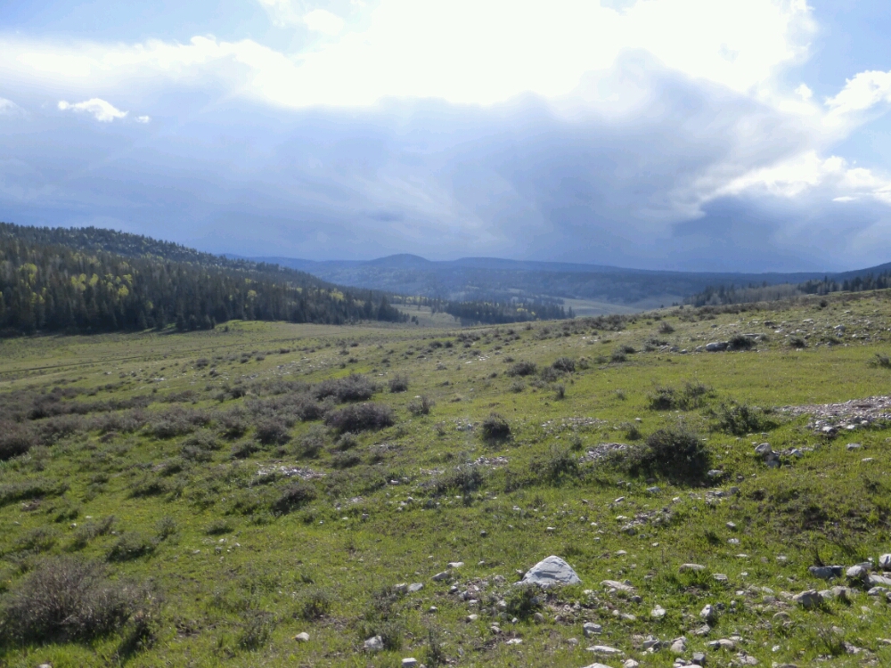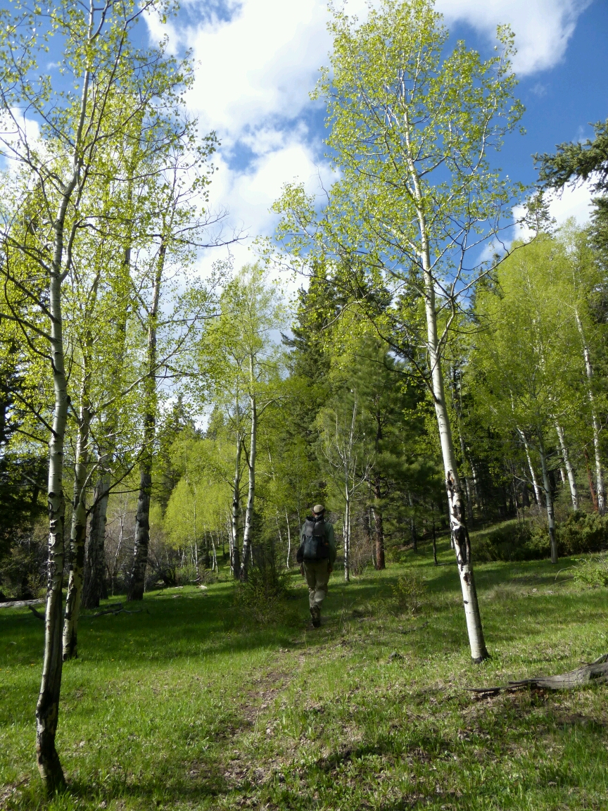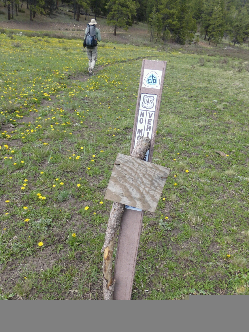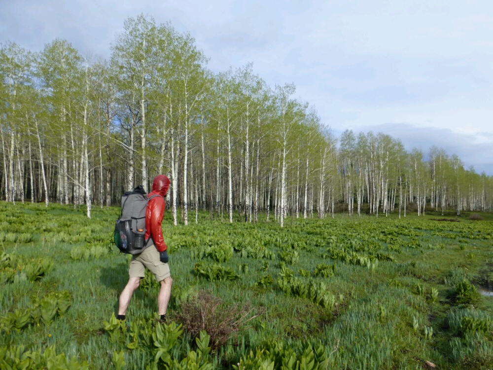 Our camp amid the spruce and fir proved to be the nicest spot we could have hoped for last night. For the first hour of this morning found us walking through spring green aspen groves (i.e. soggy). False hellebore, larkspur, and dandy lions along the roadside. Elk grazing along fence lines.
