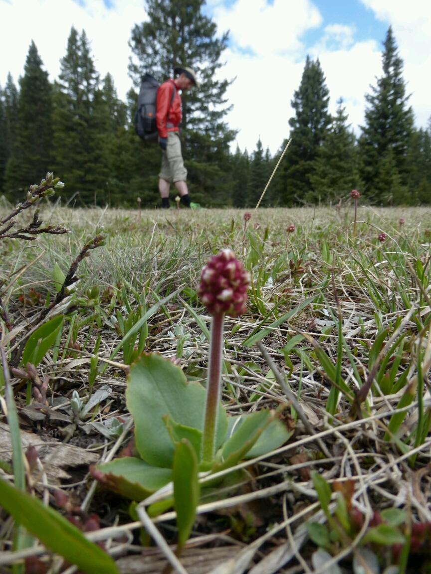 We hike on and up into 10,000 foot parkland of bunch grasses, meadow, and spruce. The first glacier lilies are flowering! Bright yellow and cheery dancing petals. They are far more pleasant to admire than the silver shine of beer cans that litter the roadside. More pleasant are the streams overflowing with snow melt. Occasionally we negotiate muddy stretches of road and snow drifts but this is easy parkland walking.