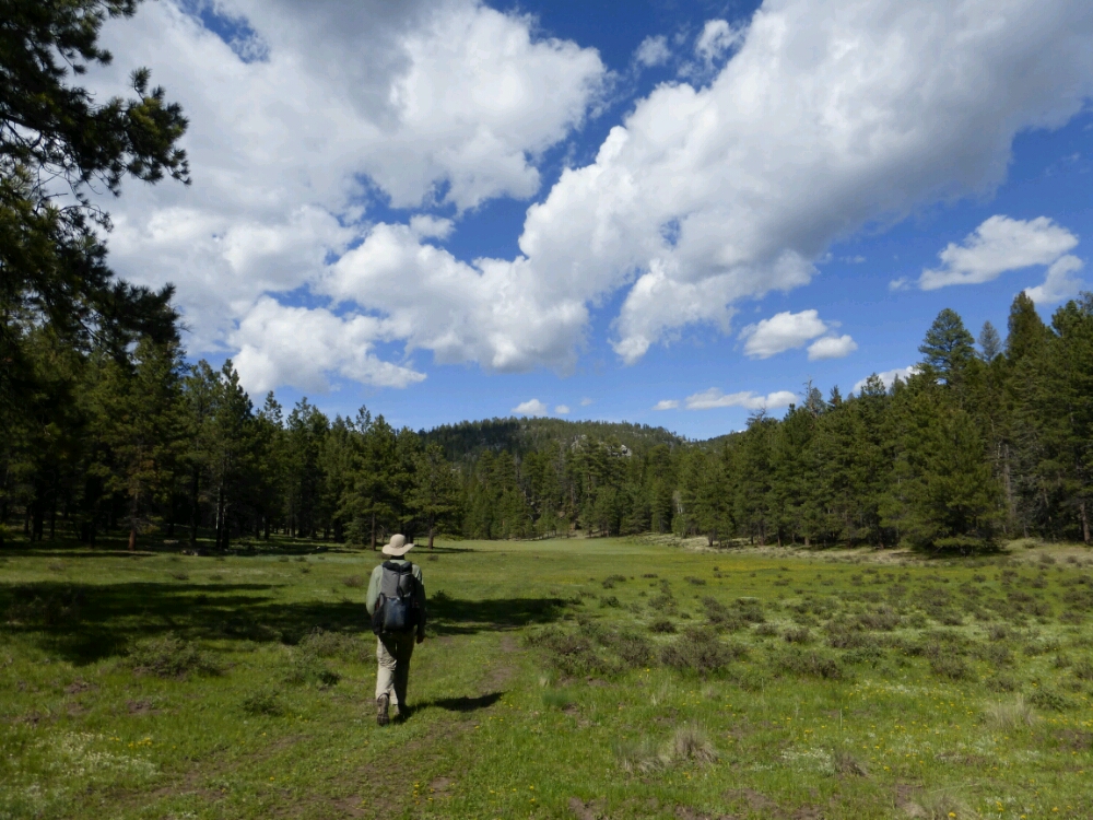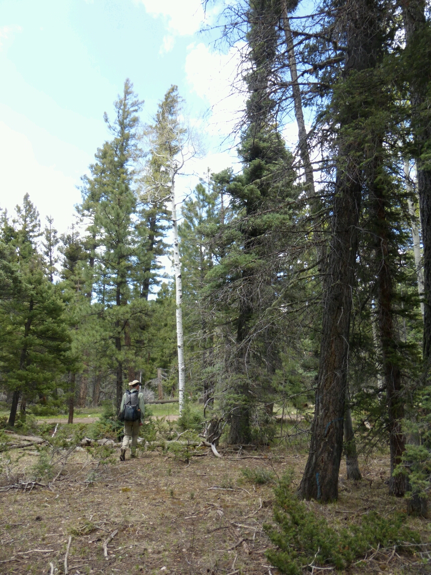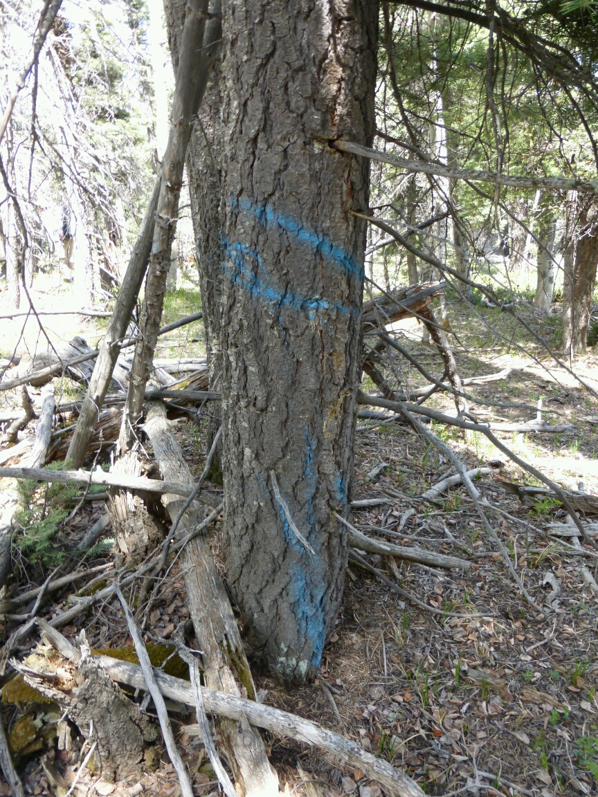 More road walking. We opt for a cross country alternate, suggested by Ley, that cuts off 1.5 miles of road. Far more interesting to walk in the Ponderosa stand, hop over blowdown, and try to figure out the harvest prescription for the marked stand. The blue paint on some of the trees reminds me fondly of work.