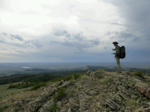 Gabriel on Divide Peak. Looking out we could see distant lightning and storms a brewing. We got a little wet before stopping to camp.