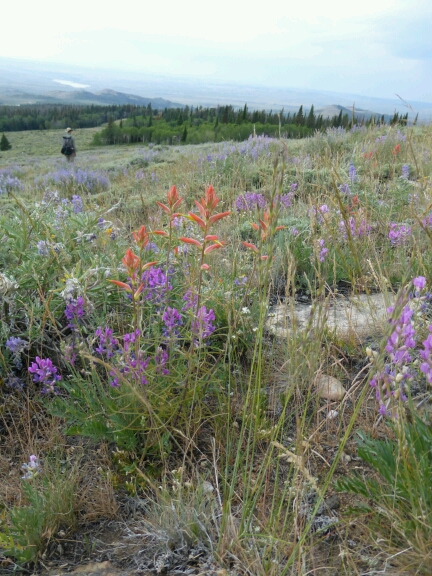 A few plants of note: sulpher buckwheat, lupine, penstemons, bistort, yellow stonecrop, showy daisies, paintbrush (WY’s state flower), locoweeds, sandwort, yarrow, harebells,wild onions, mariaposa lillies, and phlox. And especially of note: cactus (chicken and hen-I think) and bitterroot.