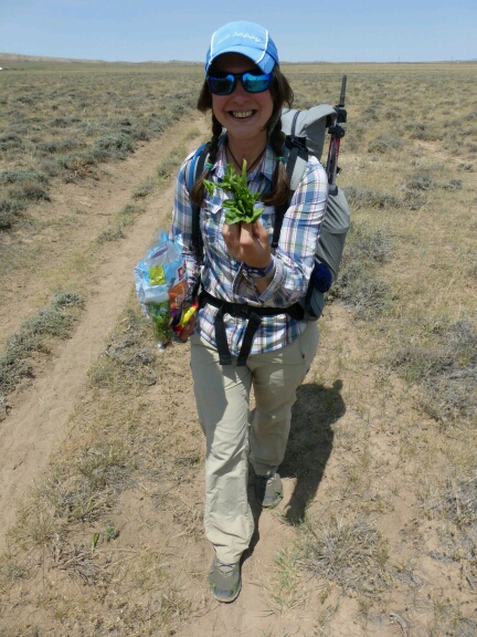 I especially love these photos Lindsay (crossing the great divide basin) — what a different looking area, and beautiful. Dry wide-open-sky country. Very cool to follow a portion of Oregon Trail! Wow, that looks like a BIG tick? Mukmuk looks like he’s holding up well to the rigors of his second long trail trek. I’ve wanted to see Larkspur since 3rd or 4th grade when I read Nancy Drew and the Mystery of Larkspur Lane! Love your comments and photos! (and the very cute one of you with leafy greens, I guess Gabriel took!) I have only recently learned how to view your entries through email notices, and still cannot figure out how to make “comments”! :o) Did you post a photo(s) of that really LONG meadow you guys hiked through recently? Gabriel mentioned it on the phone and I’m imagining it was lovely. Boni