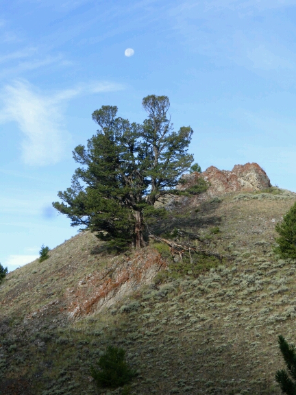 In the still and calm of morning, the only evidence of last night’s storm is wet ground and Soulshine’s missing tent stakes. (He found one, then three others later in the day.) The air pungent with the clean scent of sagebrush after a night of rain. Pronghorn run across the golden fields. Elk herds graze in the pale morning sun, but stand alert and bound into spruce at their first glance of us. The moon is still high in the sky.