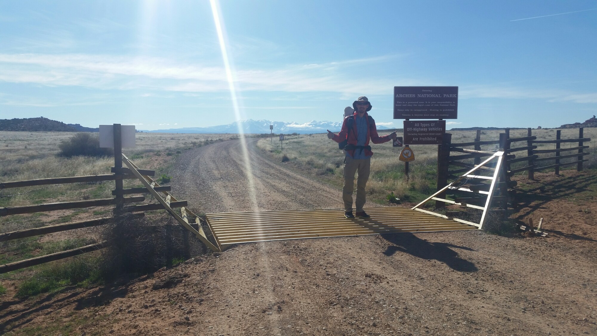 In honor of DNR and Bubbles, Gabriel thumbs-up the cattle guard as we step into Arches NP via Salt Valley Road.