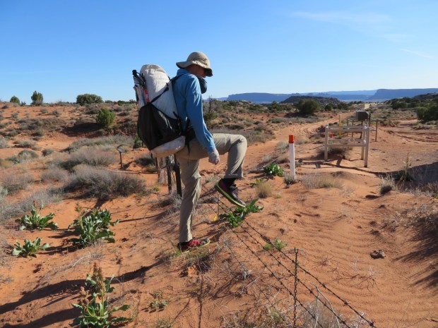 Staying legit, Gabriel crosses over the barbed wire fence that keeps cattle out of Arches NP. It’s nice that the bottom wire is barb free for easier wildlife passage.