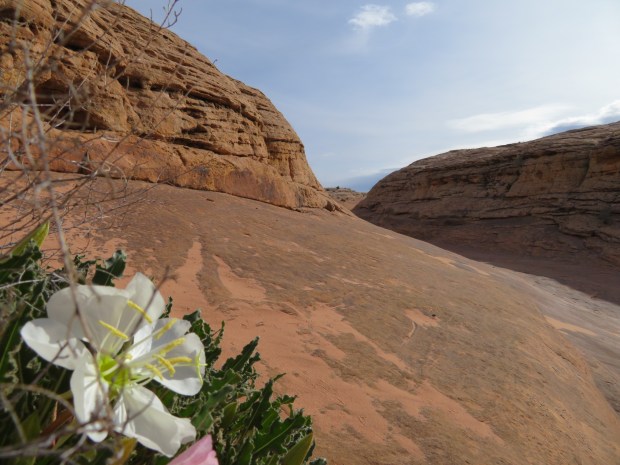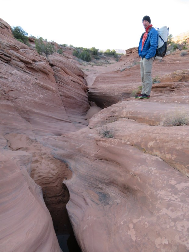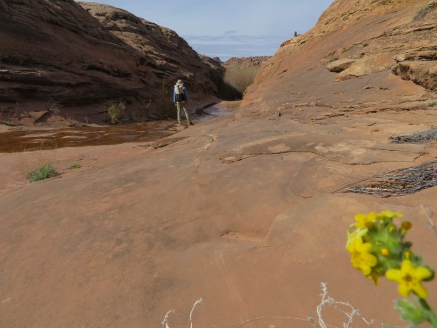 Golden cryptanth and Gabriel on the slickrock before our entry to Courthouse Wash.