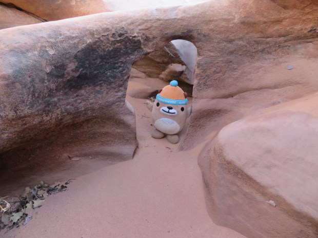 Descending into Courthouse Wash. We alternate walking on rolling waves of sandstone and the soft fine sand of the wash. The sand is a good story teller of recent happenings of the neighborhood. Tracks stamped into ground of kangaroo rat hops, coyote trots, centipede trains, and jackrabbit bounds.