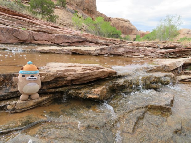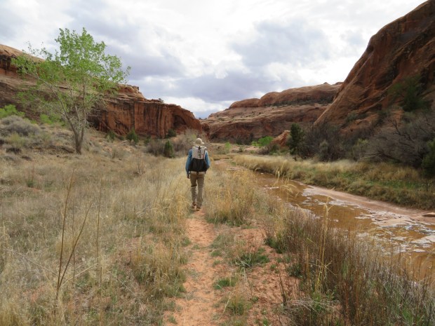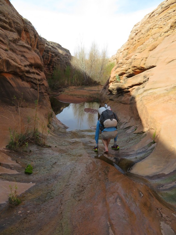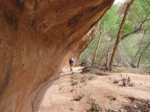 After some slow going in Upper Courthouse, we crossed under the bridge and found the trail down Lower Courthouse Wash. A clear trail and a stream flowing the entire way, but always the path took us to a spot for a dry crossing. We rambled under alcoves, lounged by a series of little waterfalls, and admired the rock. There is going to be a lot of rock admiring for the next 800-some miles.