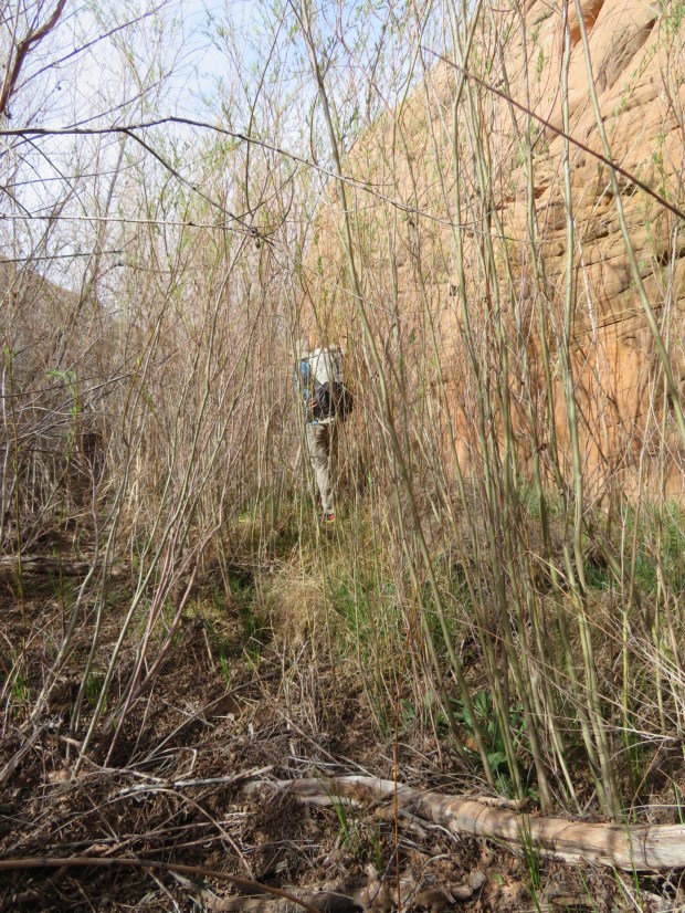 Some tamarisk thrashing and willow weaving ensued. Not hideous, but definitely not smooth sailing. The tamarisk had its way with my favorite hiking shirt. Sure it had done about 3,000 miles of trips, days of brushy field work in the woods, and had a few holes (patched up mind you), but I had hopes for it to get one last grand adventure. The tamarisk ripped my right sleeve to shreds in about three miles. So it goes.