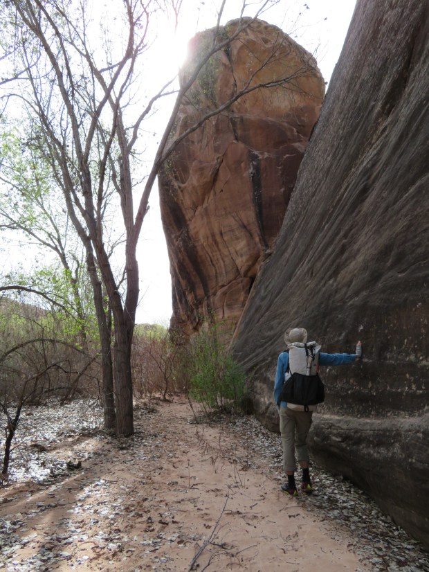 Aside from the brush damaging my shirt, we were liking Courthouse Wash. Lots of bird song, young Fremont cotton leaves a vibrant green fluttering in the breeze, and beautiful sandstone. Mostly we admired the rising cliffs and formations of the canyon. Gabriel especially enjoyed fine tuning his ability to read map topography and interpret the landscape. We noted every prow, buttress, bend, and amphitheater. Different than reading the topography of the Cascades. We are practicing now for when the skills will be especially needed later on in the trip.