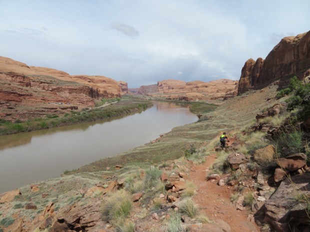 Mountain biker along Jackson Trail and the mighty Colorado River below. At least here, it is red and brown like its name. All this water – none of it reaches the sea.