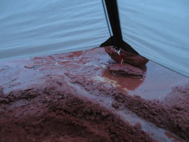 We ducked into the tent just as the rains stared pummeling the silnylon walls. Such timing! We settled in for dinner, starting with anti-malaria pills. Because of course most trips to Utah require such practices (actually they are a lingering requirement from Tanzania, but offer some side benefits for the first weeks on the Hayduke). And then we noticed the small stream coming right for our tent. Not a big deal, but no need to test the waterproofing of our floor. We quickly applied the knowledge of our Kilimanjaro tent setter, Jackson, and dug/sculpted trenches around the tent. The water then flowed around our little gray home and we had a peaceful night.