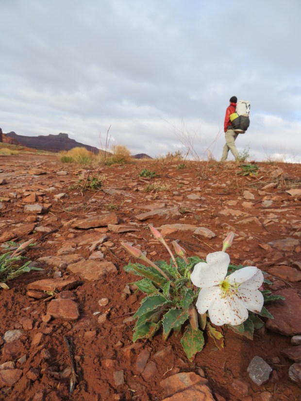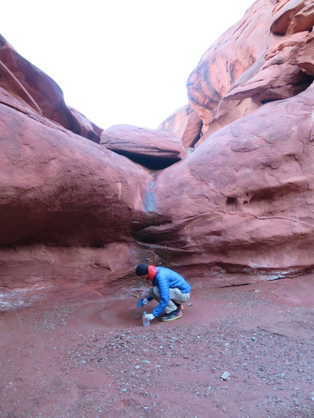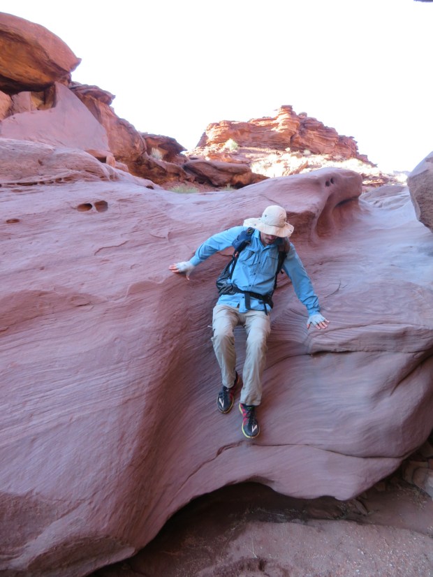 Water is the primary limiting factor of our walk the next few days. We got a tip from our friend, Daybreaker a few days ahead of us (via DNR, than you!), that he didn’t find water in Indian Creek. Which could make for a 48 hour water carry in the days ahead. It’s not today’s problem, but it’s in the back of our minds, so we study the potholes.