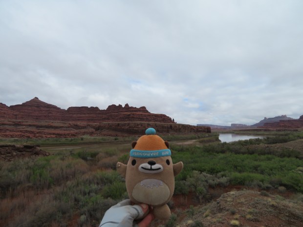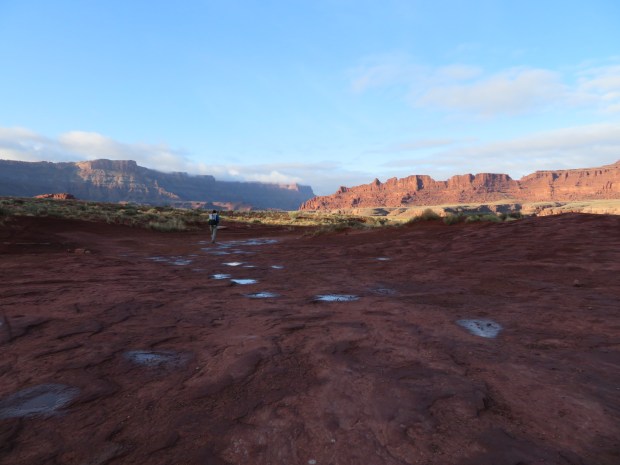 A fresh, crisp, clear morning after last night’s hard rain. All the new water has us intrigued to find and understand the landscape’s potential for potholes. Such depressions in the slickrock, be they a few centimeters or a few feet deep are beneficial. They also minimize how much water we must pick up when we detour to the Colorado River for our hydration needs.