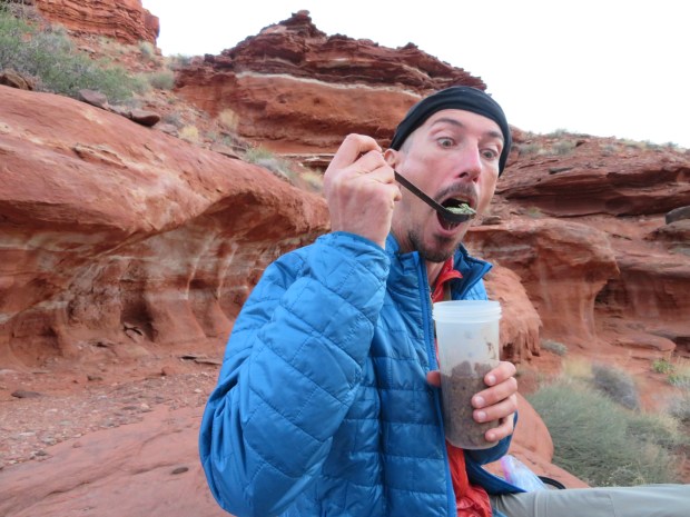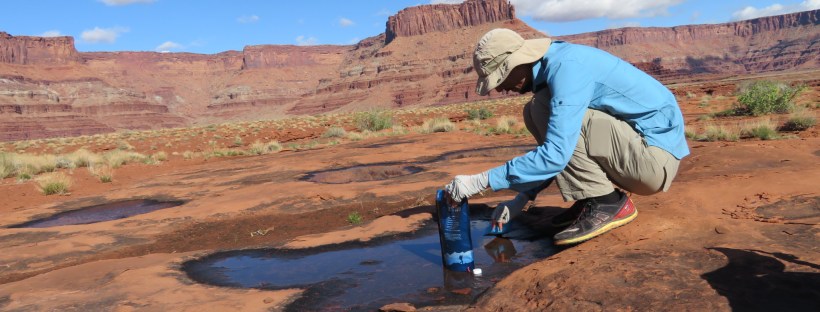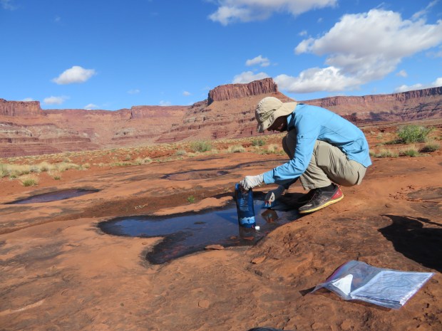 The pothole water requires catching the reflective glimmer of water on slickrock. Then carefully skimming the surface of the water so as not to disturb the algae at the bottom of the depression. It takes time to gradually fill our two liter Platypus water containers. But it is the thing to do. Because of some sediment and nearby cow pies, we filter and chemically treat this water too.