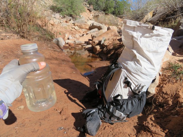 Over the ridge, we find sandstone benches that make for good (cryotobiotic soil-free) walking. Our pace speeds up. But then slows for interesting plants and bonus water (water you didn’t expect and don’t have to carry) in potholes. There are patches of snow on the north facing slopes. But the high point of the route is snow free.