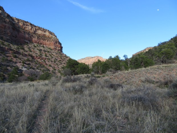 The bottom of the canyon has juniper and pinyon woodland, with grassy bends, prickly pear cactus, and phlox. Nearing 7 pm, our general time to look for camp, we look at our maps and realize that the canyon ahead has steep terrain for a few miles. Best find home for the night. A bend later, we see a cluster of junipers with nice duff, free of cryptobiotic soil and only a few cactus.