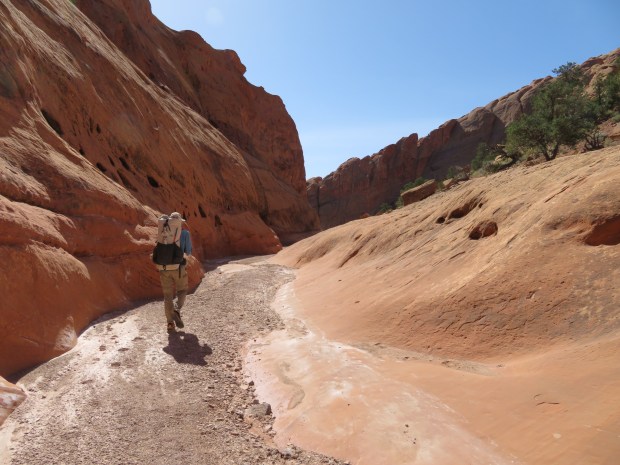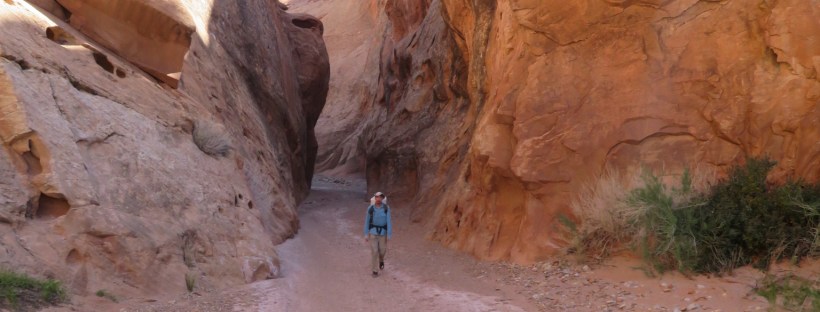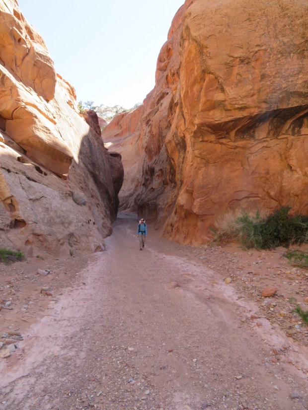 GPS: not needed; people sighted: we saw and talked to one backpacker enjoying the canyon shade and reading a book, he is brilliant to linger here; roads: a couple miles up the awesome Burr Trail!