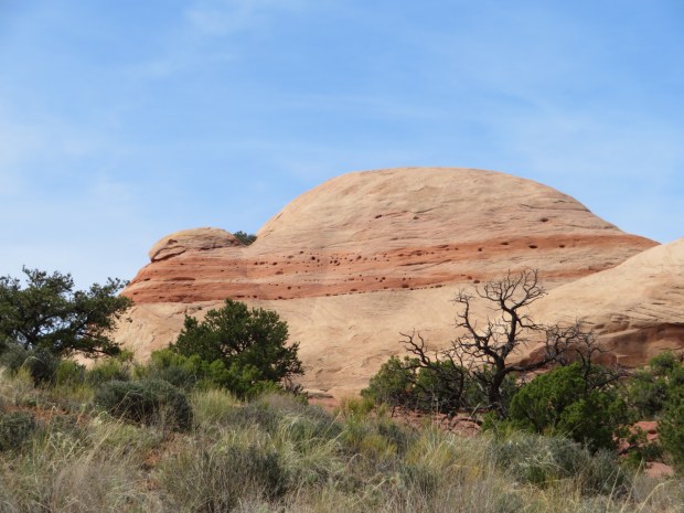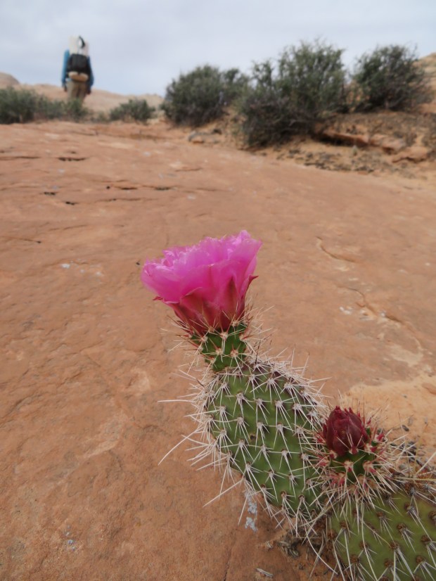 And what a gorgeous day! Hard to believe we started out along Halls Creek with sandy walking, thickets of tamarisk, and lots of cattle sign. By mid morning we transitioned to a magical world of Navajo slickrock. We hiked up and over the Waterpocket Fold via the Baker Trail. Scampering about benches of Navajo sandstone that changed color, held waterpockets, and gardens of cactus, grasses, wildflowers, and mini groves of pinyon and juniper. A wonderland.