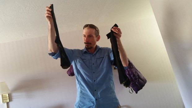 Gabriel celebrates finding a sock he thought he lost in Hanksville. He speculates it got to Escalante via an alternate Hayduke route. Happiness is having three pairs of clean socks.