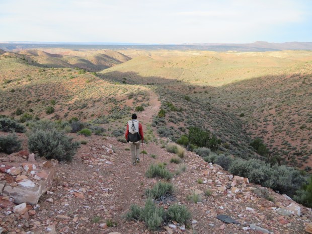 Cool morning at the bottom of Navajo, we hiked out of the drainage via Surprise Valley and the rolling Burning Hills. Warmer up top and pretty red hills dotted with the green of pinyon, juniper, sage, and Mormon tea.