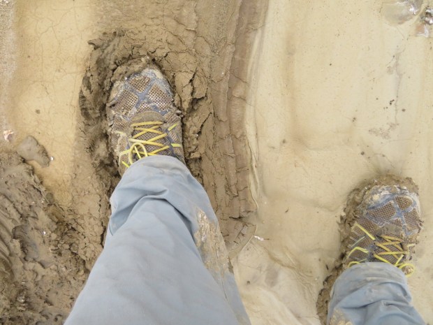 More mud walking that coated our shoes and pant legs and dust devil gusts. We laughed, you’d think after 6,000 miles of long distance hiking, we’d know how to walk. But we kept slip slidin away.