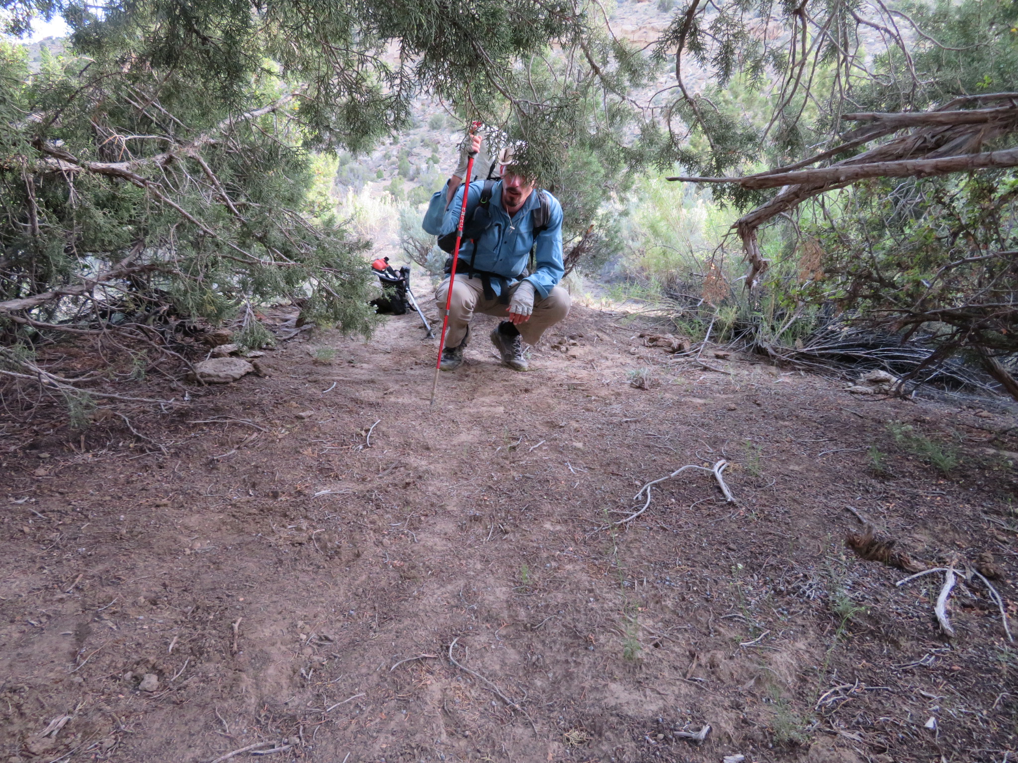 At last at the confluence of Paradise Canyon and Escalante Canyon we looked for a place to camp. With the wind gusting at times, we opted to crouch under a juniper tree to cowboy. Of course the cows had already given their stamp of approval to the spot.