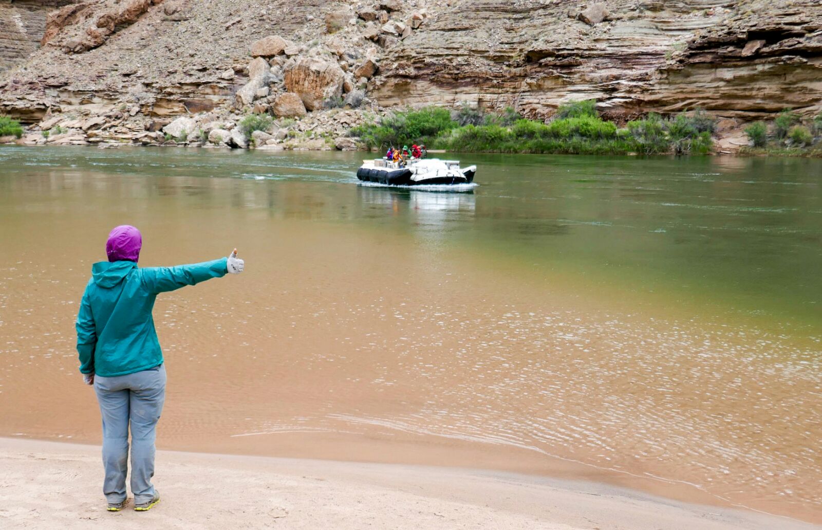 Hitching to cross the Colorado River. We got a ride from this US Geological Survey team. It was cold out, I was wearing almost all my layers to stay warm while waiting. We are also on solar time and never bothered to adjust our watches to AZ time. So we realized this morning, as we started to wait it was 5:30 in the morning AZ time. We sat aroind for three hours. Oh well, it is a very nice hitching beach. There is much to admire in the morning along the river.