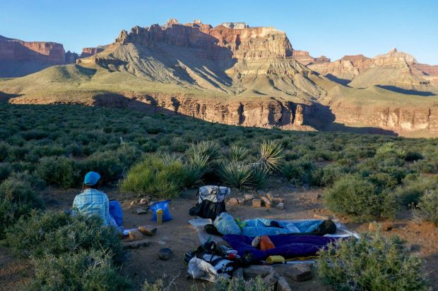 Next day, climb up the to the Tonto Plateau. The Tapeats sandstone ledges are now 1500 feet above the Colorado River and Vishnu schist and super group rocks are below in Granite Gorge. Camped on a bench by Boulder Canyon. Moon light fills the sky. No headlamps needed. When I get up at night, I look for kangaroo rats in the blackbrush.