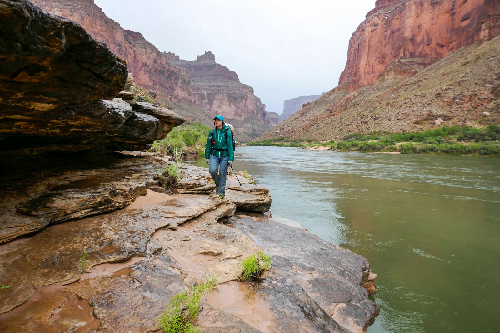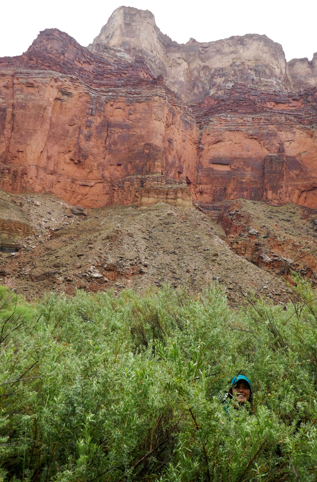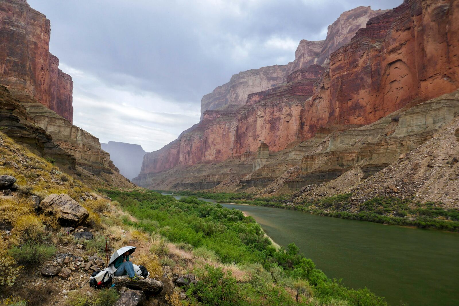 Breakfasted with rafters (French toast and French press coffee). Marveled at hundreds of violet green swallows in Marble Canyon. Got soaked by rain. Got flushed out of some overhanging boulders by lightning. Boulder hopped and bushwhacked to awesome Tapeats sandstone ledges to the hitching beach. Besides the lightning and cactus spines it was a super fun day! We dried out by evening.