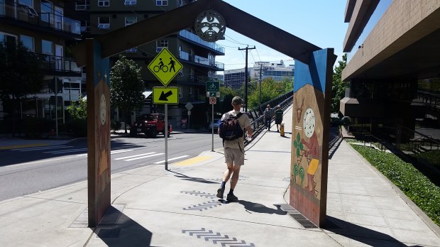 Gabriel runs through the Snoqual arch created by Native American artist and story teller Roger Fernandes. This arch is at the start of the overpass that connects Lower Queen Anne to Myrtle Edwards Park. Tomorrow we’ll bike to the place that is central to the origin story told on the panels about Moon and the Two Sisters.