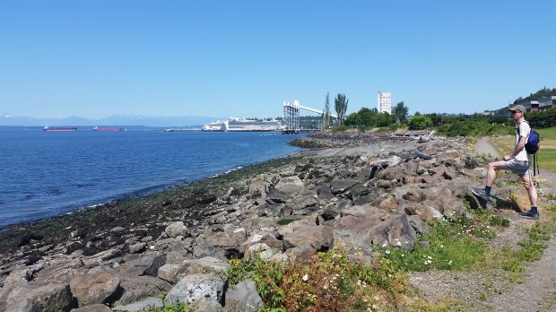 Running along the Elliott Bay Trail in Myrtle Edwards Park, we can see the tide is getting low.