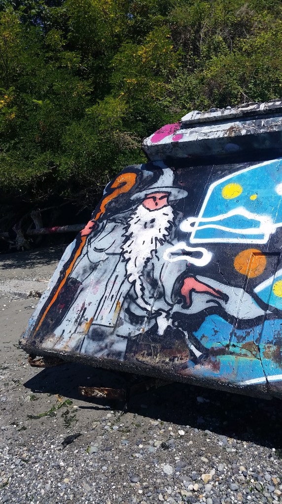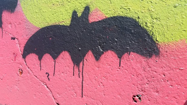 Cute bat graffiti on the ever changing concrete slab down by the water.