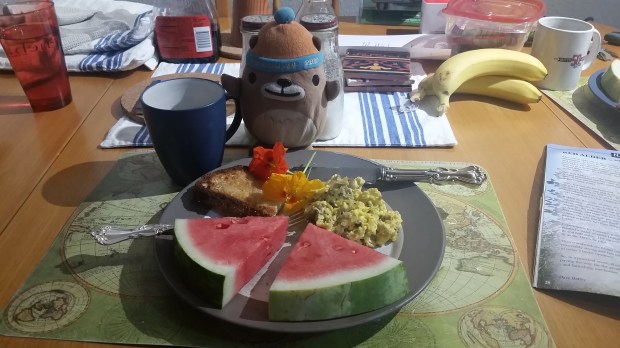 Mukmuk enjoying his cup of coffee, eggs from A&A’s chickens, homemade bread, nasturtium blossoms, and watermelon!