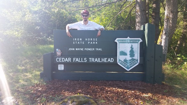 We got back on the Snoqualmie Valley Trail and in couple of miles made it to Rattlesnake Lake and the Cedar Falls trailhead, the western terminus of the Palouse to Cascades State Park Trail. The P2C(spt) – as Gabriel and I started to call it – is a nearly 224-mile rail-to-trail gravel path that goes from Rattlesnake Lake out to the WA/ID border.