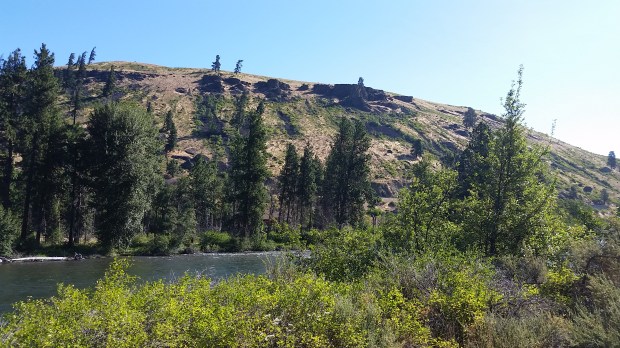 Andesite outcroppings and grassy bluffs above the Yakima River. This section sure would make a fun float trip.