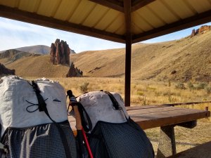 - Our packs at the Slocom Creek Campground admiring the views while we sat at the picnic table eating breakfast.