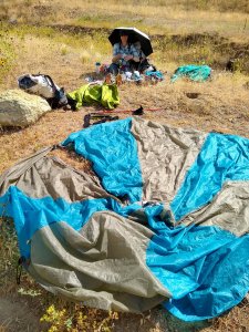 Just after noon the clouds gave way to sunshine and we were drying out our wet gear while eating lunch in the shade of our now sun umbrellas-another new experience thanks to the ODT.
