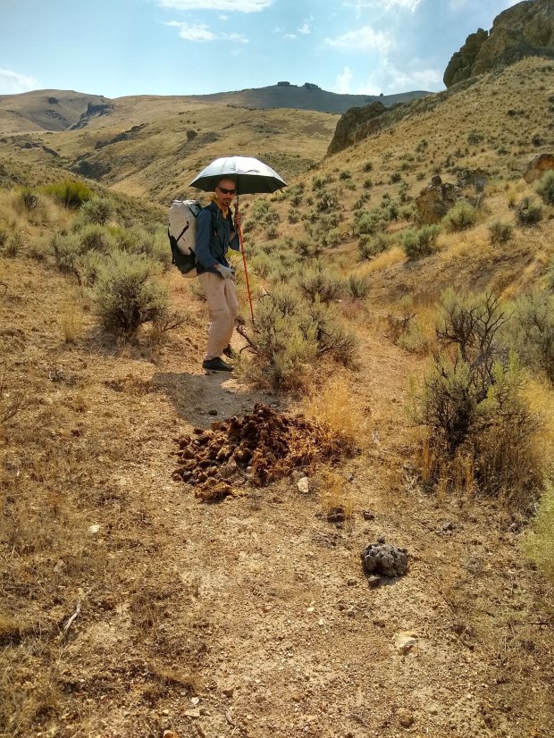 The air pungent with the scent of sage after a good rain. It’s one of my favorite smells, what great way to start the day. We enjoyed walking old two track road as we watched clouds roll over the hills with mist rising off wet vegetation. Amid sun breaks and ominous clouds we started traveling down a wash. Met a gopher snake warming up on a cow trail in a bit of sun. (Reminding us of a friend’s experience in Owyhee country where he often encountered snakes on trails in the morning.) We’ll stay alert!